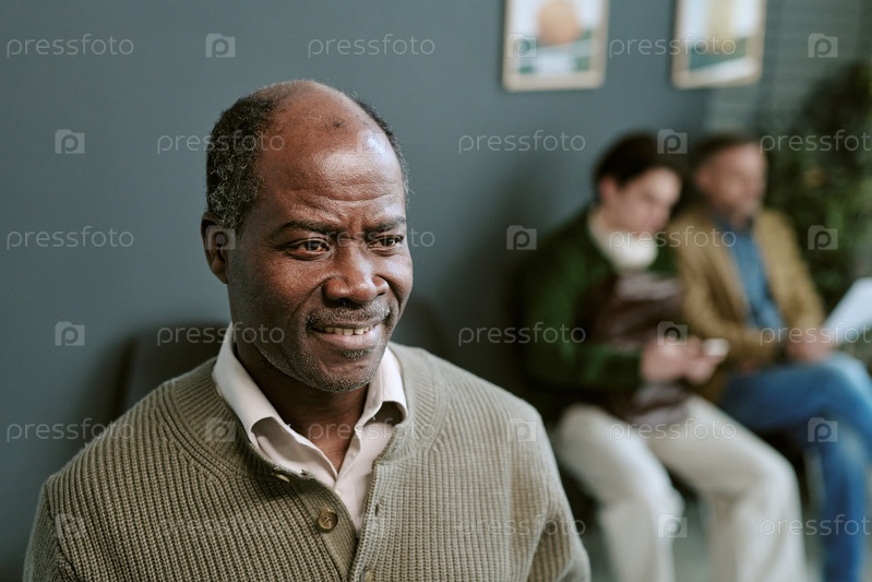 Портрет чернокожего мужчины среднего возраста, улыбающегося во время ожидания внутри отделения банка