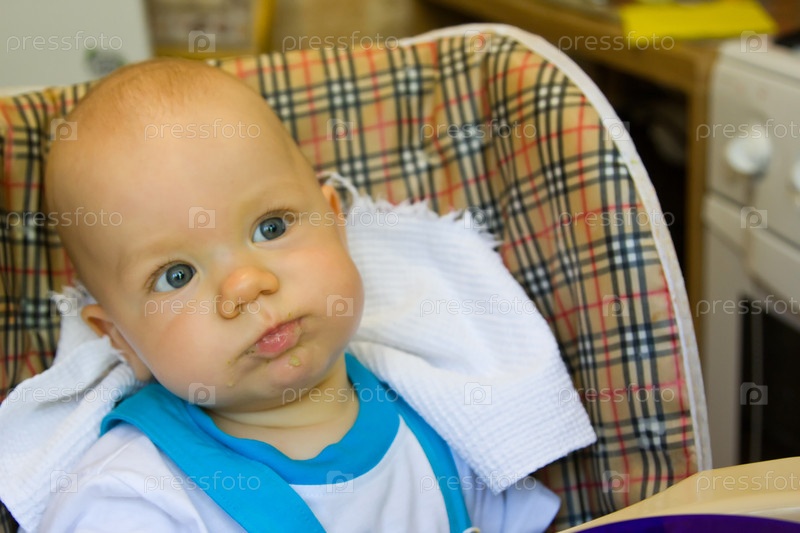 Маленький ребенок в стульчике для кормления