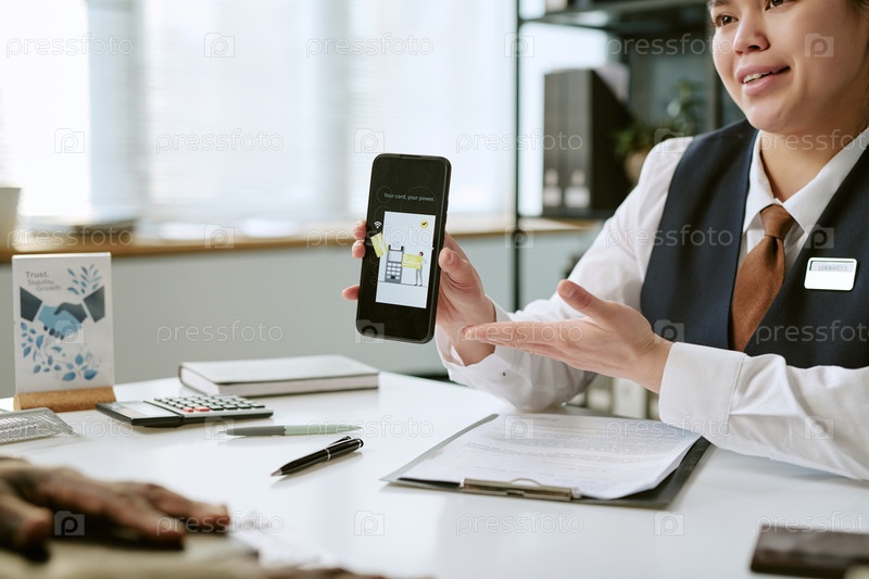 Среднего возраста азиатская женщина объясняет мобильное банковское приложение в отделении банка