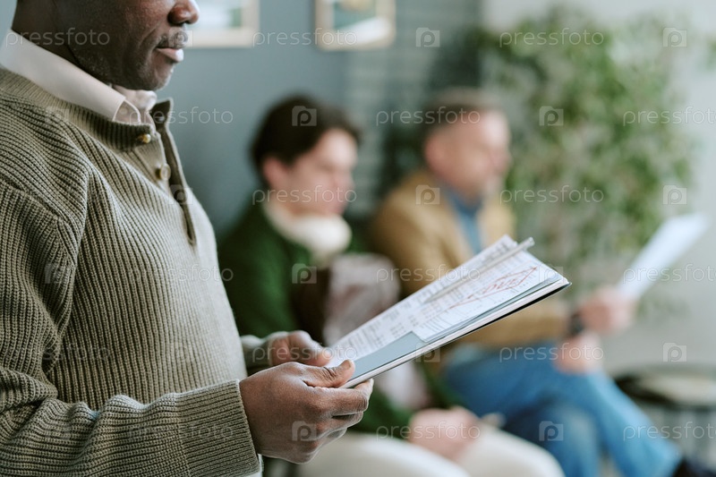 Чернокожий мужчина средних лет держит документы, ожидая внутри отделения банка