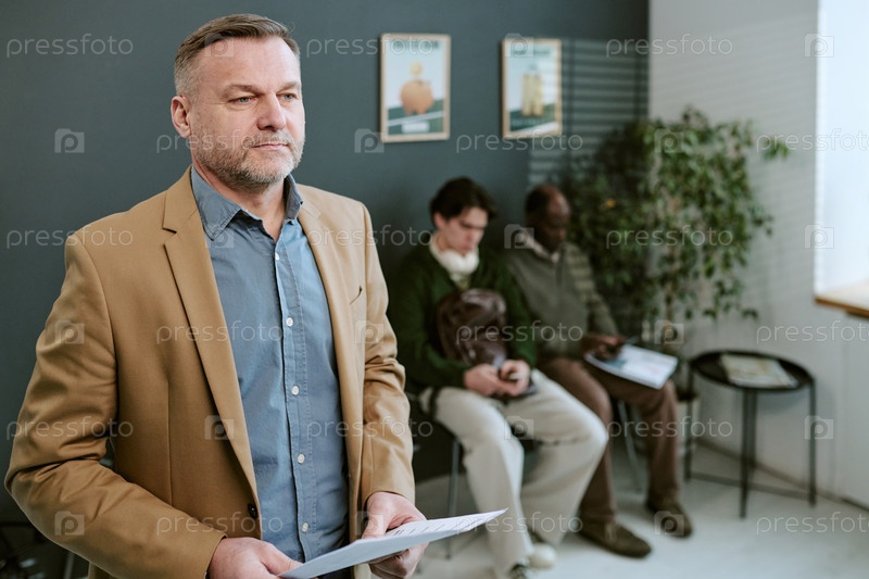 Кавказский мужчина среднего возраста, держащий документы и ожидающий внутри отделения банка