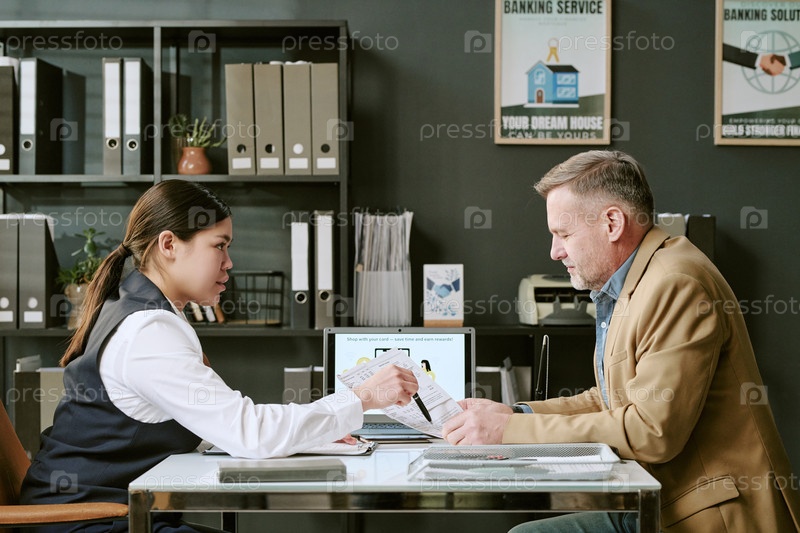 Молодая взрослая азиатская женщина помогает белому мужчине средних лет с банковскими документами