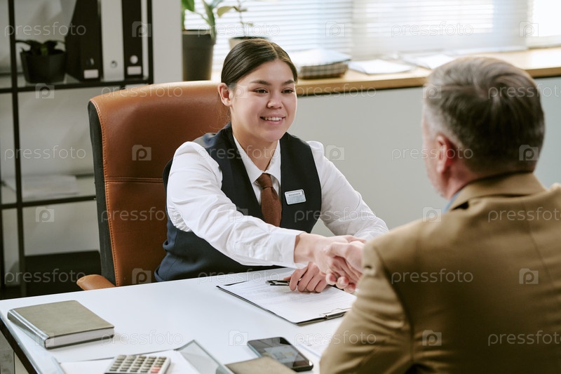 Молодая взрослая азиатская женщина приветствует белого мужчину средних лет в филиале банка