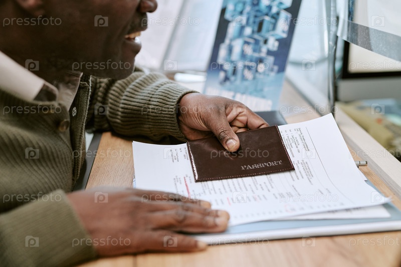 Старший чернокожий мужчина улыбается, показывая паспорт и документы на банковском стойке