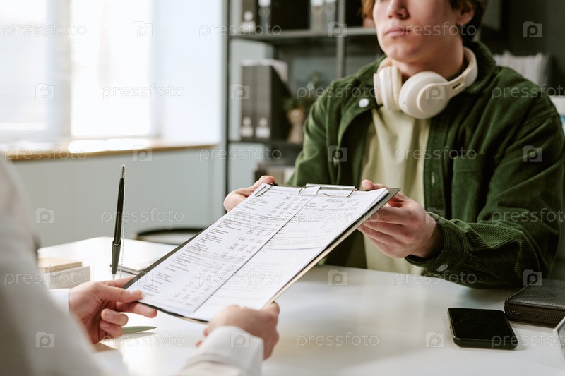 Молодой белый мужчина получает финансовые документы от сотрудника банка в филиале