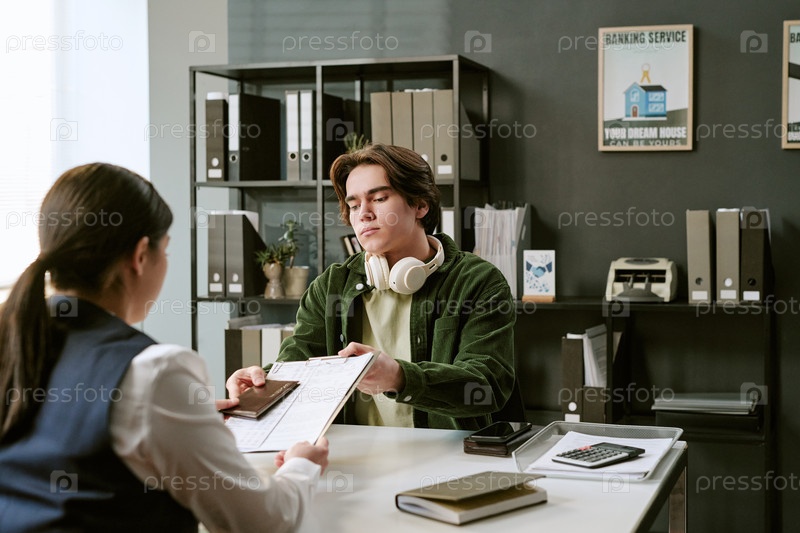 Молодой кавказский мужчина подписывает документы с азиатской женщиной в банковском отделении