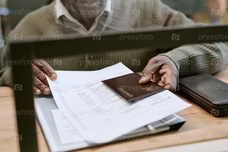 Старший чернокожий мужчина, представляющий паспорт и документы на стойке в отделении банка