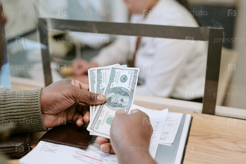 Чернокожий мужчина среднего возраста считает наличные деньги в окне банковского отделения
