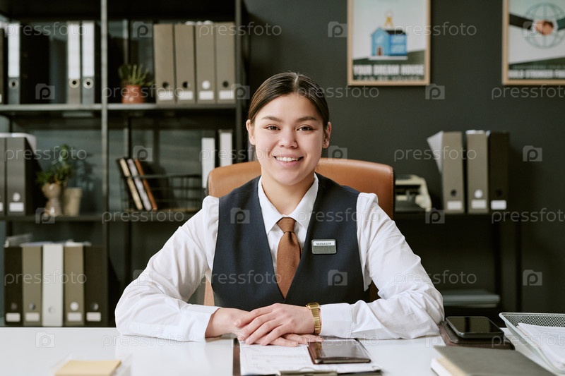 Портрет молодой взрослой азиатской женщины, улыбающейся во время работы в банковском отделении