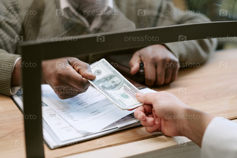 Чернокожий мужчина средних лет вручает наличные деньги кавказскому банковскому кассиру в кассе филиала