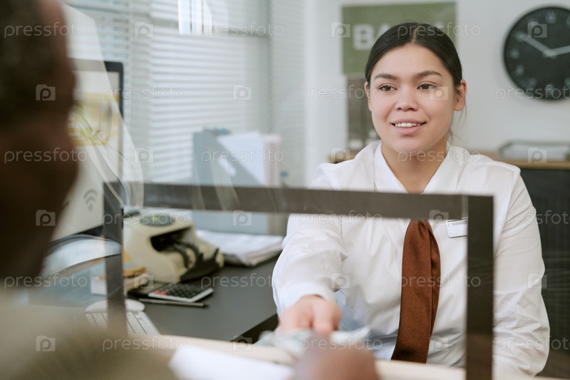 Молодая взрослая азиатская женщина помогает клиенту в окне банковского отделения