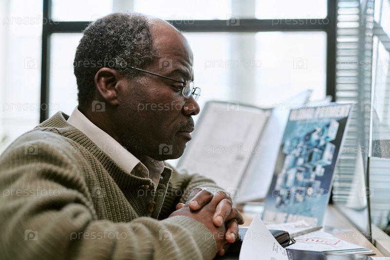 Чернокожий мужчина средних лет просматривает финансовые документы в отделении банка