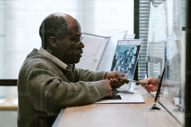 Старший чернокожий мужчина проводит транзакцию с банковским кассиром на стойке филиала