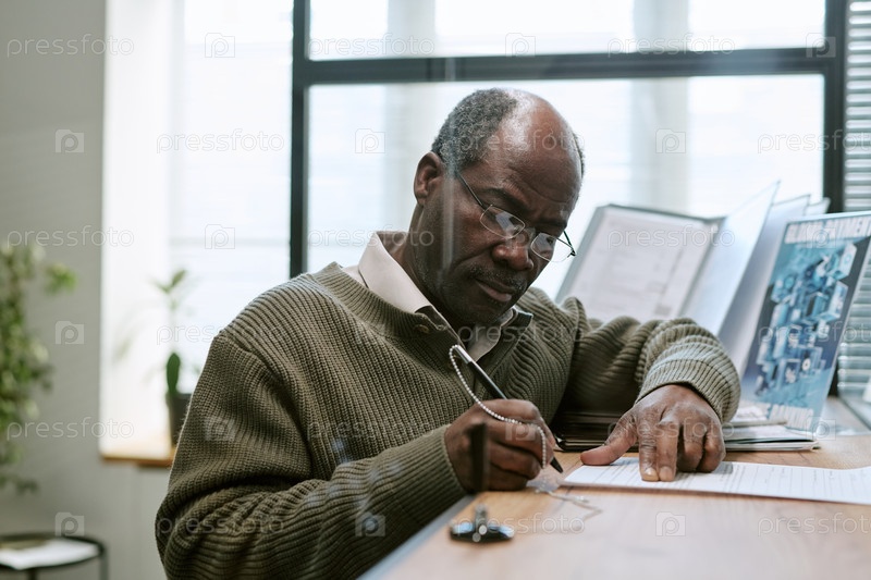 Чернокожий мужчина средних лет подписывает документы на счету в отделении банка