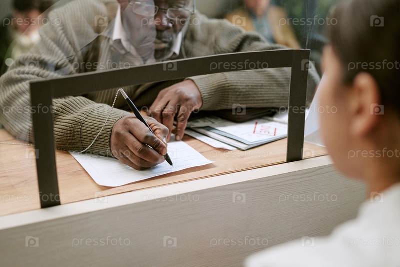 Старший чернокожий человек подписывает документы на стойке отделения банка во время транзакции