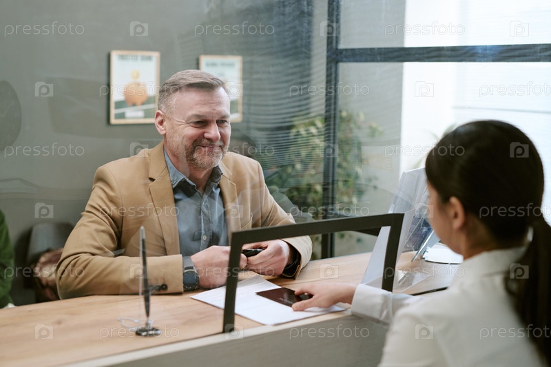 Кавказский мужчина средних лет улыбается, разговаривая с сотрудником банка в филиале