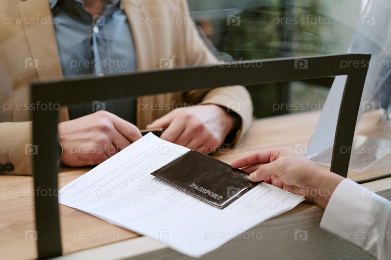Мужчина среднего возраста представляет паспорт и документы на стойке отделения банка