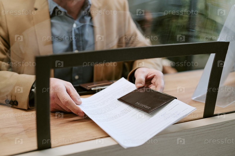 Кавказский мужчина средних лет представляет документы и паспорт на стойке отделения банка