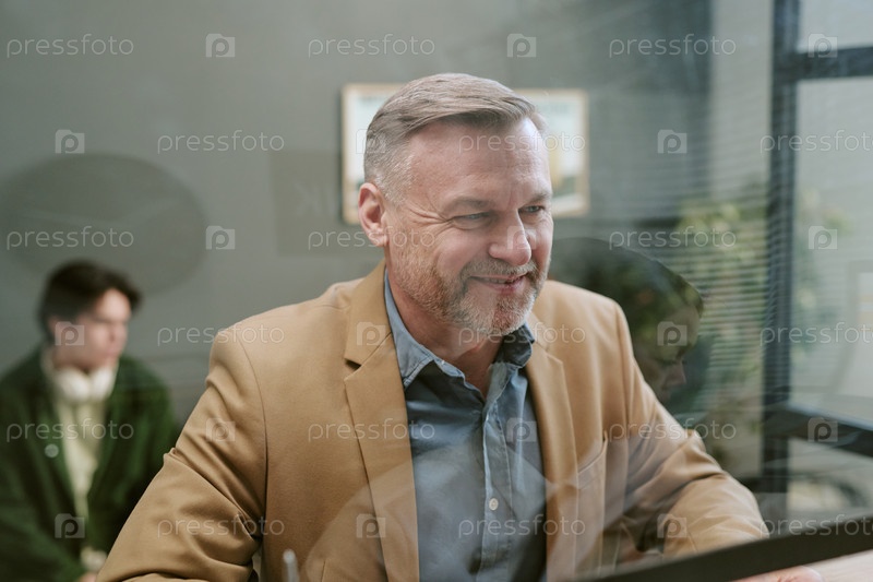 Кавказский мужчина средних лет улыбается, работая в банке