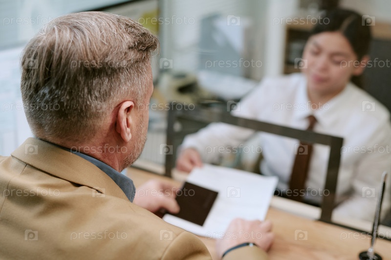 Кавказский мужчина средних лет консультирует молодую азиатскую женщину на стойке отделения банка