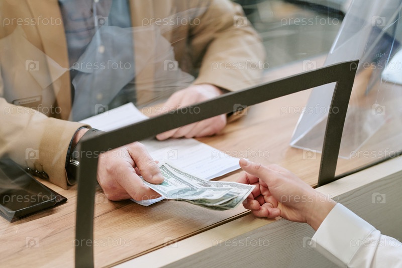 Кавказский мужчина среднего возраста вручает наличные банковскому кассиру в кассе филиала