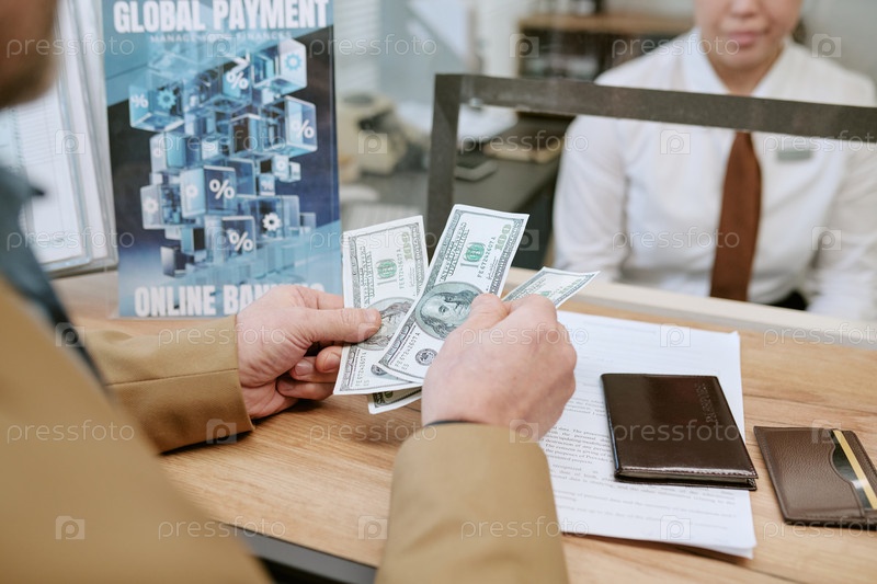 Кавказский мужчина средних лет подсчитывает наличные деньги на стойке обслуживания отделения банка