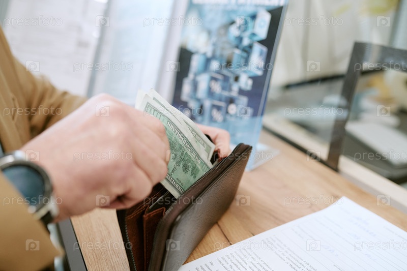 Кавказский мужчина среднего возраста снимает наличные на счету в отделении банка