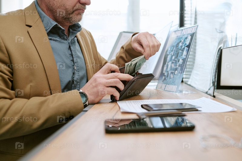 Кавказский мужчина среднего возраста считает наличные деньги на банковском отделении во время транзакции
