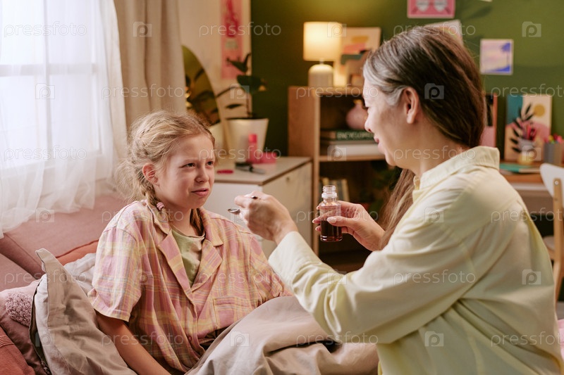 Женщина среднего возраста дает лекарства больной девушке в постели