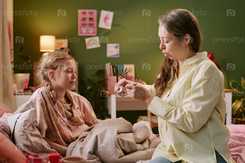 Женщина средних лет ухаживает за больным ребенком в спальне