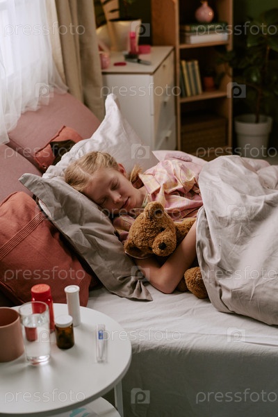 Девочка спит в постели, обнимает игрушечного медведя днем