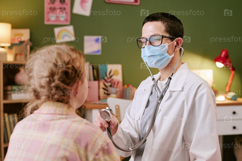 Женщина-врач, осматривающая девочку с помощью стетоскопа