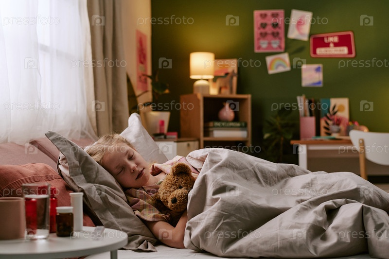 Девочка спит в постели обнимает игрушечного медведя в уютной спальне