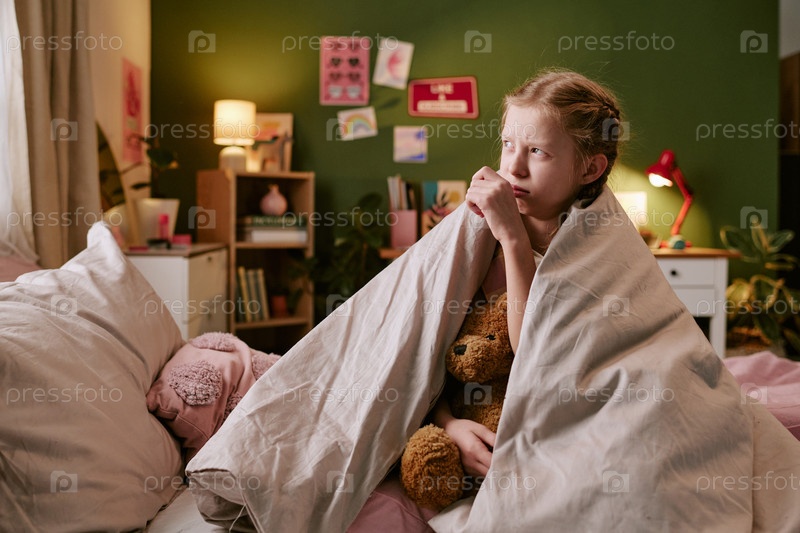 Девушка обнимает игрушечного медведя, пока сидит в постели и выглядит озабоченной