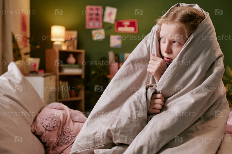 Девушка прячется под одеялом и выглядит тревожной, сидя на кровати