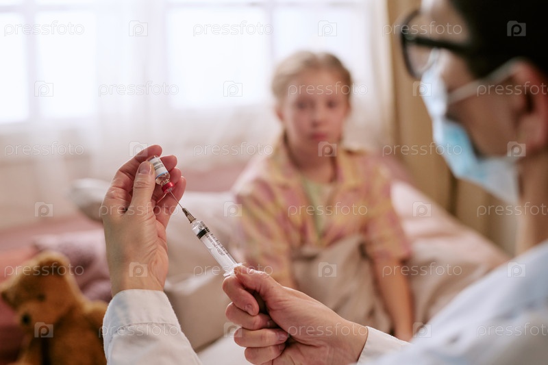 Девушка смотрит, как женщина-врач готовит прививку в клинике