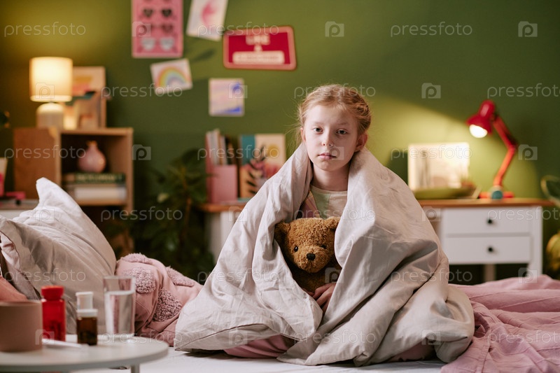 Портрет девушки, сидящей в постели и держащей игрушечного медведя с озабоченным видом