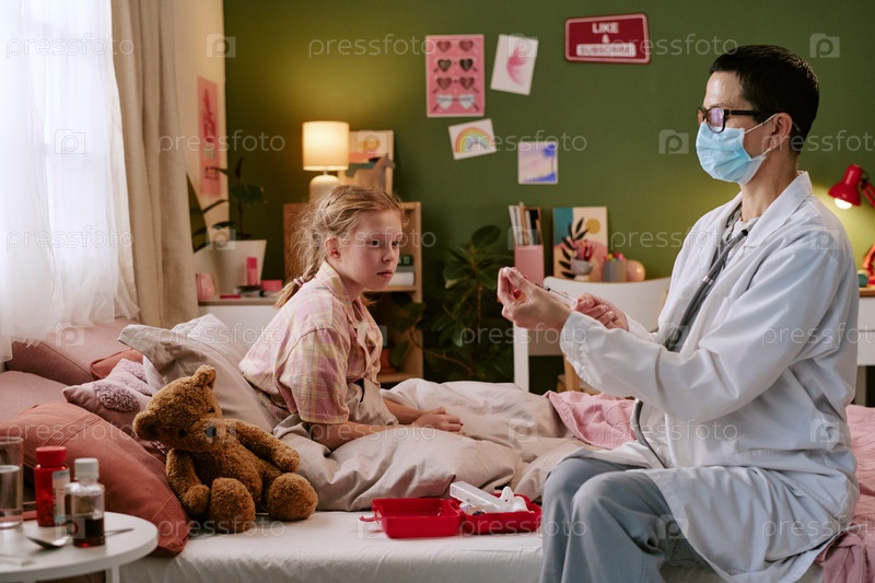 Сидя в постели смотреть, как женщина-врач готовит инъекцию девушке