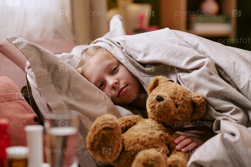 Девочка отдыхает в постели, держит игрушечного медведя и чувствует себя плохо