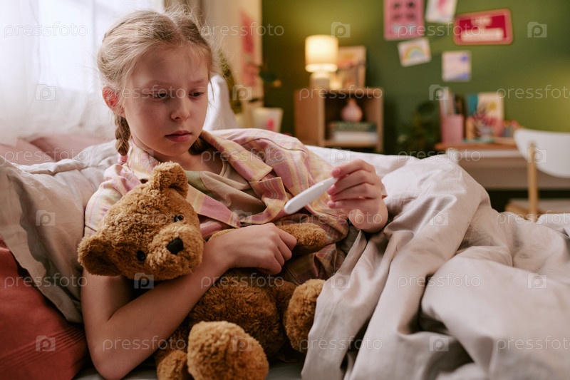 Девушка держит термометр и игрушечного медведя, лежа в постели