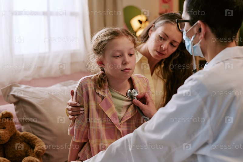 Мать поддерживает девочку, в то время как врач слушает ее грудь