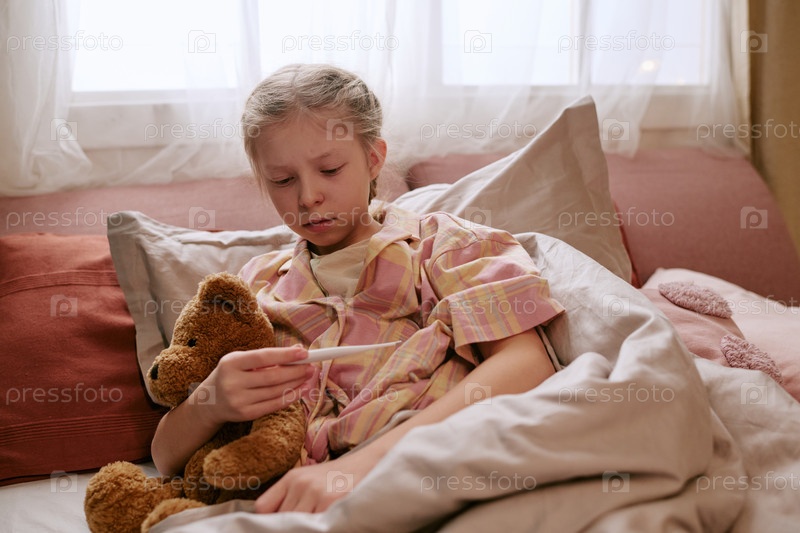 Девушка, лежащая в постели с термометром и набитым животным