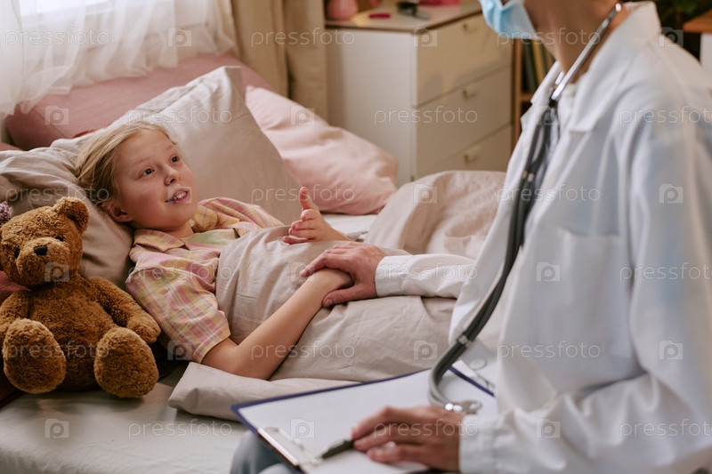 Девушка, лежащая в постели держась за руки с женщиной-врачом во время осмотра