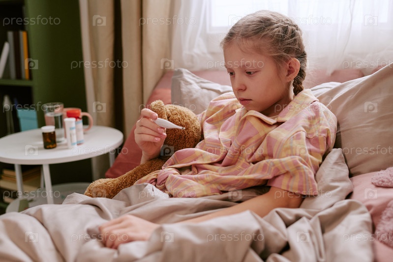 Девочка, лежащая в постели с термометром и наполненной игрушкой