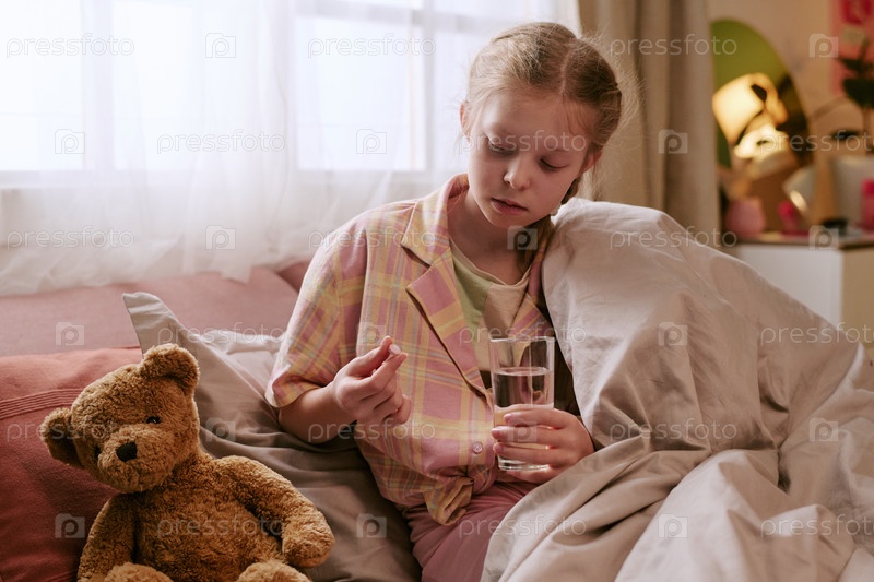 Девушка, принимающая лекарства, сидя в постели и держащая стакан воды