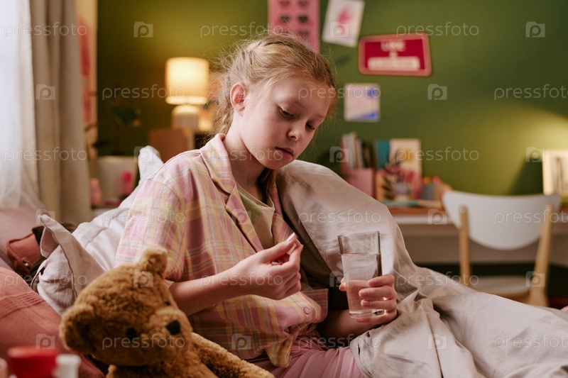 Девушка принимает лекарства, сидя в постели во время утренней рутины