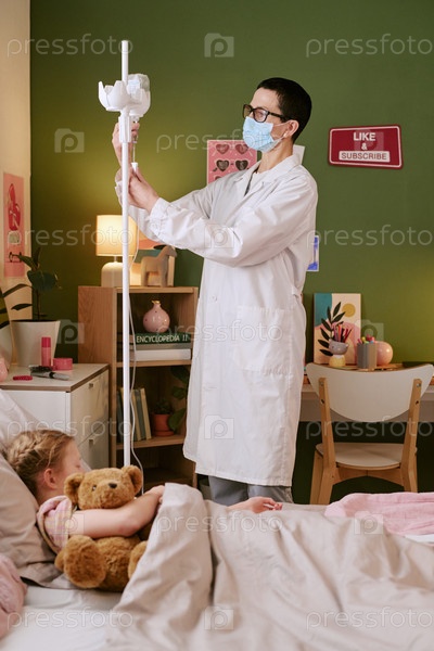 Женщина-врач, регулирующая IV капли для больного пациента ребенка в госпитальной комнате
