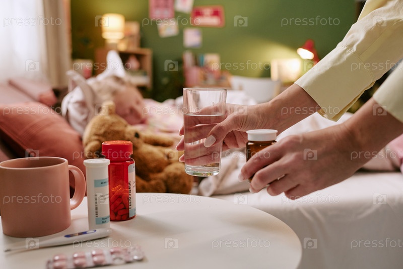 Женщина дает лекарства и воду больному ребенку, отдыхающему в постели