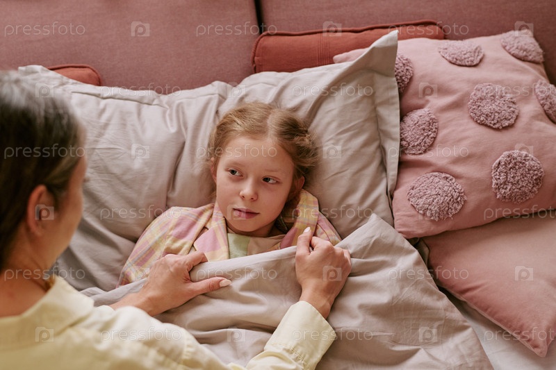 Девушка, лежащая в постели, которую утешает женщина среднего возраста дома