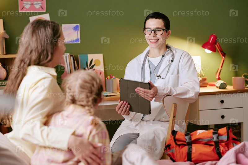 Женщина-врач консультирует мать и маленькую дочь во время домашнего посещения
